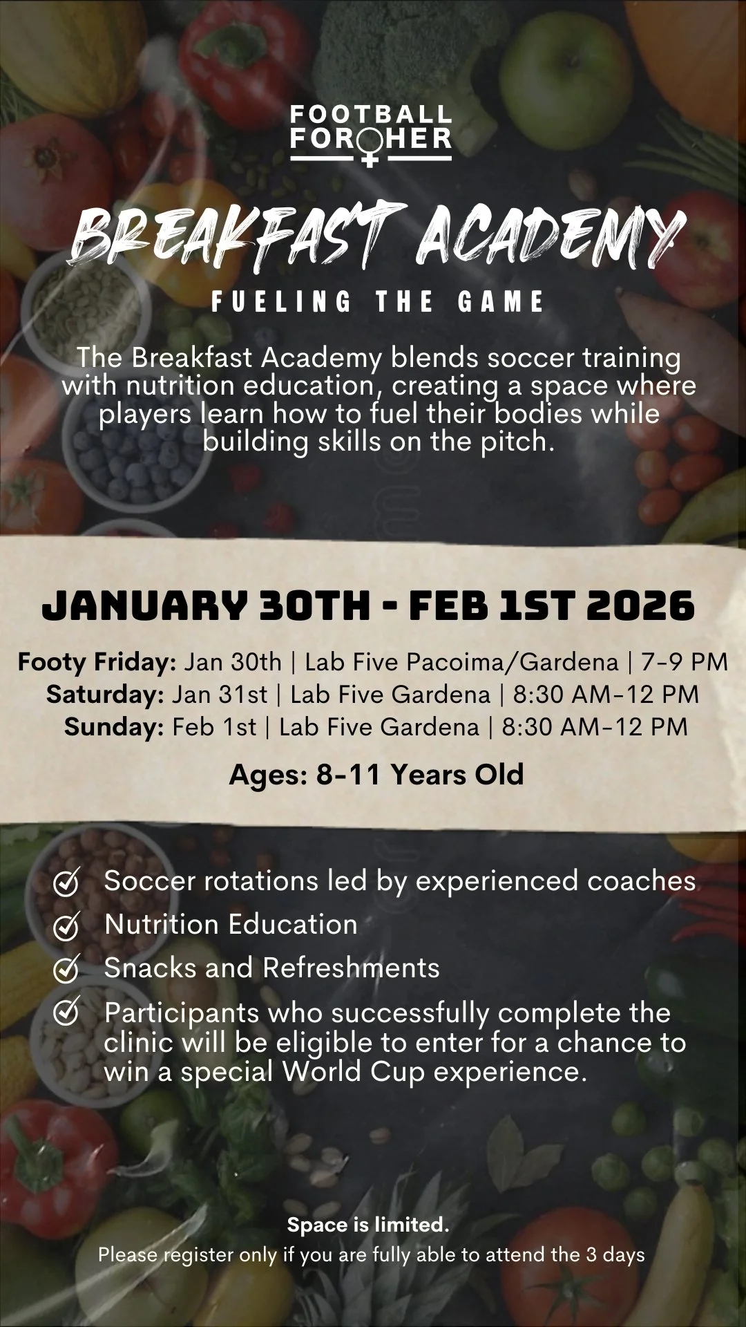 The Breakfast Academy: Fueling the Game is a soccer-based learning experience that combines play, nutrition, and community. Through fun, high-energy sessions, players learn how breakfast, hydration, and teamwork fuel their bodies and minds. The program supports healthy habits on and off the field while building confidence, connection, and love for the game.